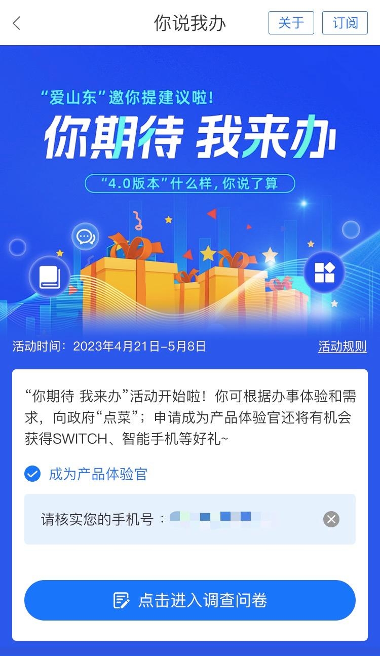 “愛山東”你說我辦“你期待 我來辦”活動于421至58開展,屆時用戶可暢所欲言,根據辦事體驗和需求,向政府“點菜”;參與過程中,申請成為“愛山東”產品體驗官還將有機會獲得Switch、智能手機、掃地機器人等驚喜好禮。