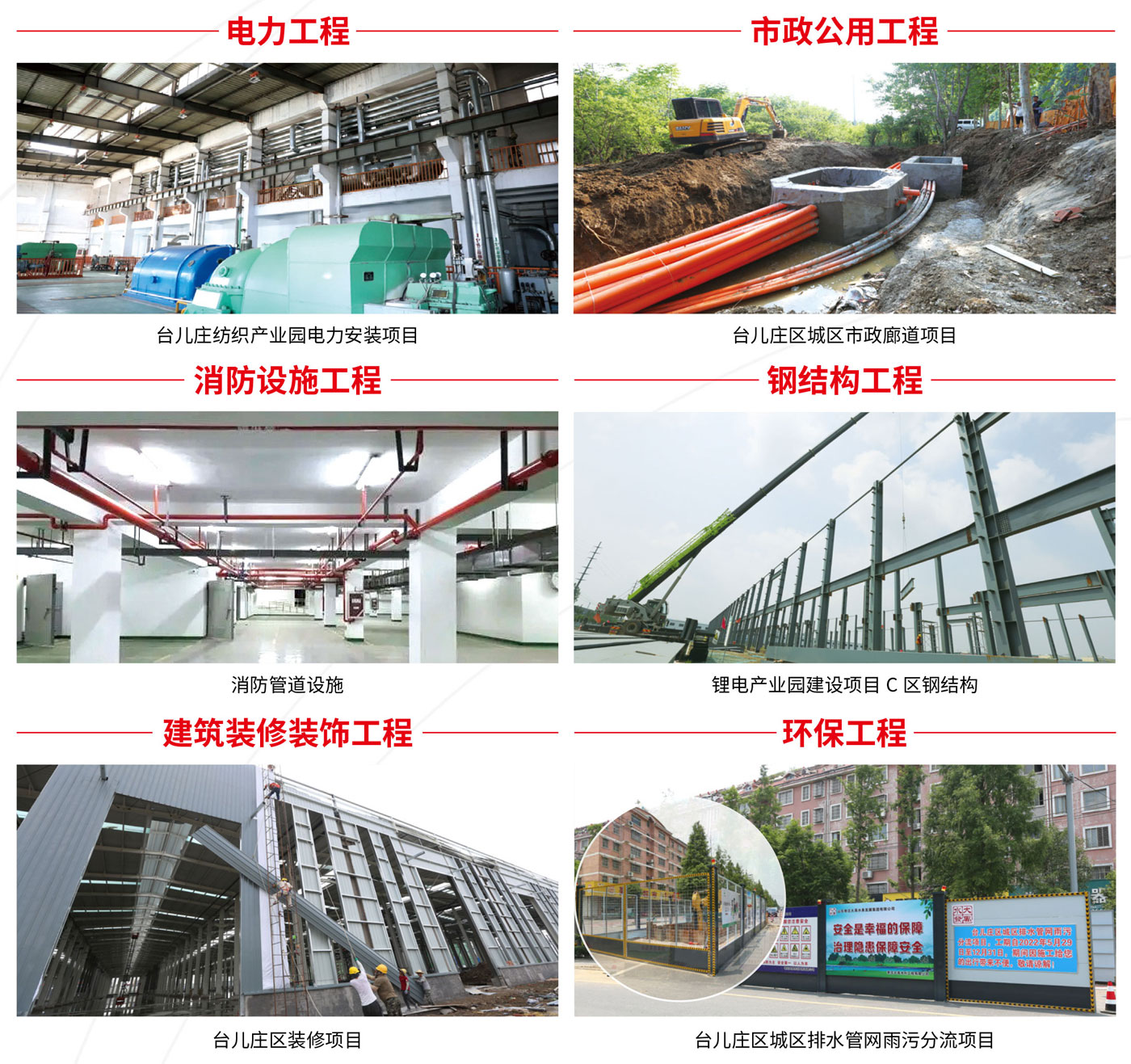 基建工程為集團(tuán)主營業(yè)務(wù),擁有水利水電工程總承包貳級資質(zhì)、市政公用工程施工總承包叁級資質(zhì)、鋼結(jié)構(gòu)工程專業(yè)承包貳級資質(zhì)、建筑裝修裝飾工程專業(yè)承包貳級、消防設(shè)施工程專業(yè)承包貳級資質(zhì)、環(huán)保工程專業(yè)承包貳級資質(zhì)、電力工程專業(yè)承包叁級資質(zhì)及相關(guān)安全生產(chǎn)許可等,以新基建推動集團(tuán)高質(zhì)量發(fā)展。